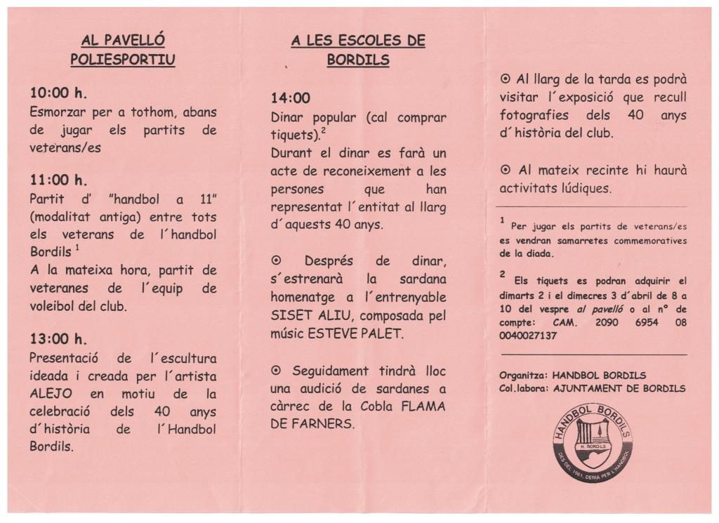 Programa activitats del 40è aniversari del Handbol Bordils . Abril del 2002