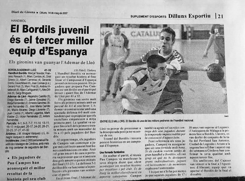 Equip juvenil del H.Bordils que es va proclamar 3r. classificat en els Campionats d’Espanya celebrats al pavelló de Vista Alegre de Còrdova el maig del 2007 .