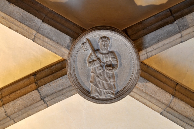 Clau de volta dels arcs que sostenen el cor de l’església parroquial. Reprsenta a Sant Pere. Foto del 2014